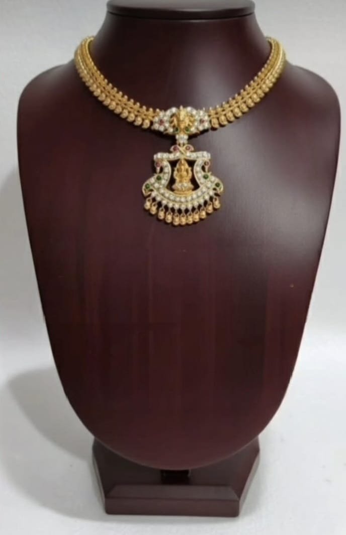 The necklace features a high-quality microgold plating that gives it a radiant gold-like shine while maintaining durability and long-lasting color. Its intricate detailing highlights classic motifs inspired by temple and ethnic jewellery, making it an ideal choice for festive occasions, weddings, poojas, and cultural events.