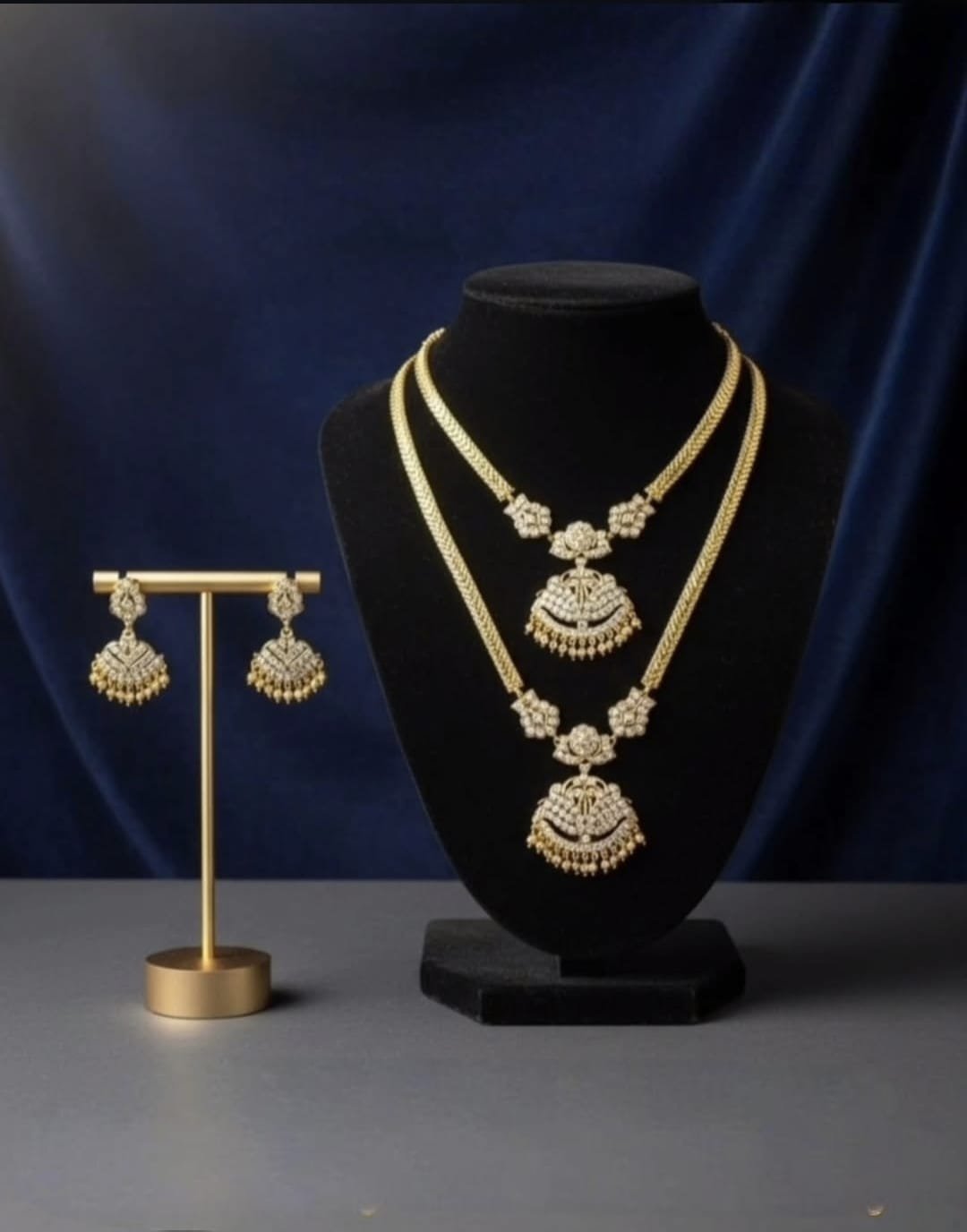 The microgold plated Panchaloha jewellery set is a perfect blend of tradition, elegance, and fine craftsmanship. This complete set includes a stylish necklace, an elegant long haram, and matching earrings, all crafted using Panchaloha, a sacred alloy of five metals known for its durability, purity, and cultural significance.